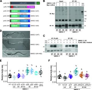 Fig 9. The in vitro and in vivo consequences of mutations in SMOC-1 that affect either LON-2 binding or DBL-1 binding. (A) Diagrams of LON-2, DBL-1, WT, and mutant SMOC-1 expression constructs used in the Drosophila S2 cell expression system. (B) Results of co-IP experiments testing the interaction between LON-2::Myc and V5-tagged WT and mutant SMOC-1 proteins. IP with anti-V5 beads and IB with anti-Myc or anti-V5 antibodies, as indicated. Experiments were independently repeated in triplicate, with representative results shown in this figure. (C) Results of co-IP experiments testing the interaction between HA::DBL-1 prodomain::FLAG::DBL-1 mature domain and V5-tagged WT and mutant SMOC-1 proteins. IP with anti-V5 beads or anti-FLAG beads and IB with anti-V5 or anti-FLAG antibodies, as indicated. The source of DBL-1 in these experiments was cell media, which does not contain full-length DBL-1, but only HA-tagged prodomain and FLAG-tagged mature domain. Experiments were independently repeated in triplicate, with representative results shown in this figure. (D) DIC images of worms endogenously expressing SMOC-1(WT) [smoc-1(jj276)], SMOC-1(M1) [smoc-1(jj499 jj276)], or SMOC-1(M1+M2) [smoc-1(jj499 jj511 jj276)], showing the long body size of SMOC-1(M1) worms, as compared to SMOC-1(WT) and SMOC-1(M1+M2) worms. Scale bar represents 50 μm. (E, F) Relative body sizes of various strains at the same developmental stage (WT set to 1.0). Groups marked with distinct symbols are significantly different from each other (P < 0.001, in all cases when there is a significant difference), while groups with the same symbol are not. The following are exceptions: the P-value between jj499 jj510 and jj276 is 0.003, while the P-value between jj499 jj510 and jj499 jj511 is 0.63. Tested using an ANOVA with a Tukey HSD. WT: N = 22. tm7125: N = 33. jj276: N = 37. jj276/+ heterozygotes: N = 29. jj499: N = 37. jj500: N = 32. jj499/+ heterozygotes: N = 19. lon-2(e678): N = 30. jj499 jj510: N = 32. jj499 jj511: N = 27. Original data sets are in S1 Data. Original images of western blots can be found in S1 Raw Images. co-IP, coimmunoprecipitation; EC, extracellular calcium-binding; IB, immunoblot; IP, immunoprecipitation; SMOC, secreted modular calcium-binding protein; WT, wild type. https://doi.org/10.1371/journal.pbio.3002272.g009 |