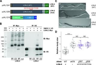 Fig 10. The in vitro and in vivo consequences of mutations in LON-2 that affect SMOC-1 binding. (A) Diagrams of SMOC-1, WT, and mutant LON-2 expression constructs used in the Drosophila S2 cell expression system. (B) Results of co-IP experiments testing the interaction between SMOC-1::V5 and Myc tagged WT and mutant LON-2 proteins. IP with anti-V5 beads or anti-Myc beads and IB with anti-V5 or anti-Myc antibodies, as indicated. Experiments were independently repeated in triplicate, with representative results shown in this figure. (C) DIC images of WT, lon-2(jj678) null, and lon-2(jj507) worms, showing their body sizes. Scale bar represents 50 μm. (D) Relative body sizes of worms at the same developmental stage (WT set to 1.0). ***P < 0.001; ND: no difference (ANOVA followed by Tukey HSD). WT: N = 21. e678: N = 31. jj507: N = 26. jj508: N = 27. Original data sets are in S1 Data. Original images of western blots can be found in S1 Raw Images. co-IP, coimmunoprecipitation; EC, extracellular calcium-binding; IB, immunoblot; IP, immunoprecipitation; SMOC, secreted modular calcium-binding protein; TY, thyroglobulin type-1; WT, wild type. https://doi.org/10.1371/journal.pbio.3002272.g010 |