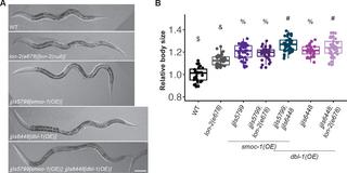 Fig 11. Overexpression of SMOC-1 and DBL-1 has an additive effect on body size. (A) DIC images of worms of various genotypes, including lon-2(0) null, smoc-1(OE), dbl-1(OE), and smoc-1(OE); dbl-1(OE) worms. Scale bar represents 50 μm. (B) Relative body sizes of various strains at the same developmental stage (WT set to 1.0). lon-2(e678) is a null allele of lon-2. jjIs5799 is an integrated multicopy array line that overexpresses SMOC-1::2xFLAG. jjIs6448 is an integrated multicopy array line that overexpresses DBL-1. For each of the genotypes except for WT, e678 and jjIs5799, 2 independent isolates of the same genotype were measured, and data were combined for statistical analysis. Groups marked with distinct symbols are significantly different from each other (P < 0.001, in all cases when there is a significant difference), while groups with the same symbol are not. The following are exceptions: the P-value between jjIs6448 and jjIs6448; e678 is 0.55, while the P-value between jjIs5799; e678 and jjIs6448; e678 is 0.007. Tested using an ANOVA with a Tukey HSD. WT: N = 28. e678: N = 37. jjIs5799: N = 39. jjIs5799; e678: N = 34. jjIs6448: N = 29. jjIs5799; jjIs6448: N = 45. Original data sets are in S1 Data. SMOC, secreted modular calcium-binding protein; WT, wild type. https://doi.org/10.1371/journal.pbio.3002272.g011 |