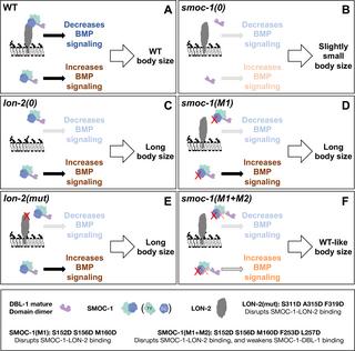 Fig 12. A model for how SMOC-1 functions to regulate BMP signaling. (A) In WT animals, SMOC-1 is proposed to both negatively and positively regulate BMP signaling. For its negative role, SMOC-1 binds to LON-2/glypican and DBL-1/BMP to sequester DBL-1/BMP. In the meantime, SMOC-1 can also bind to DBL-1/BMP to promote BMP signaling. The positive and negative roles of SMOC-1 in WT animals balance each other out, leading to a WT body size. (B) In smoc-1(0) animals, both the positive and negative roles of SMOC-1 are gone, leading to a slightly small body size. (C–E) Removing LON-2 completely [as in lon-2(0)] or disrupting SMOC-1-LON-2 interaction [as in smoc-1(M1) or lon-2(mut)] eliminates the negative role of SMOC-1, leading to a long body size. (F) Weakening SMOC-1-DBL-1 interaction in the SMOC-1(M1) background [as in smoc-1(M1+M2)] significantly attenuates the positive role of SMOC-1, leading to a non-long, WT-like body size. BMP, bone morphogenetic protein; SMOC, secreted modular calcium-binding protein; WT, wild type. https://doi.org/10.1371/journal.pbio.3002272.g012 |