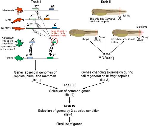 Fig. 2. Scheme of the WINEGRET method using the example of a search for genes absent in mammals, birds, and reptiles but present in fish and amphibians and involved in the tail regeneration of Xenopus tropicalis frog tadpoles