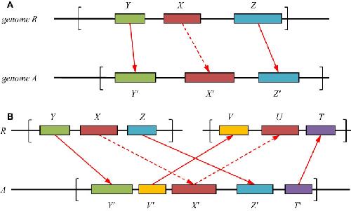 Fig. 3. The principles of orthologs search in Task I. A Forward check of a homolog X′ in species A of a given gene X in species R that involves, e.g., two witnesses: Y and Z in R and Y′ and Z′ in A. The dashed arrow represents the α-homology condition, and the solid arrow represents the β-homology (see for the explanation of α- and β-homology Step 2 in section A of Methods). The brackets indicate the chosen neighborhoods of the genes X and X′, in which the witnesses are sought. The witnesses may be arbitrarily positioned and directed within the neighborhood. B Backward check for the existence of an alternative U that is more similar to candidate X′ than X that involves, e.g., two witnesses. The dashed arrow represents the α-homology condition, and the solid arrow represents the β-homology. The brackets indicate the chosen neighborhoods of the genes X and X′, in which the witnesses are sought. The witnesses may be arbitrarily positioned and directed within the neighborhood