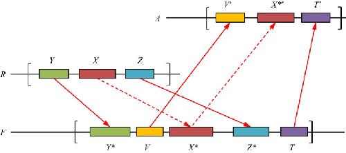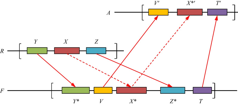 Fig. 4. Checking whether gene X from R has an ortholog X*′ in upper species A through a fish genome F that involves, e.g., two witnesses. Here, R is a fixed reference species; gene X has the ortholog X* in fish F confirmed by two witness pairs, Y–Y* and Z–Z*. The gene X* in turn has the ortholog X*′ in upper species A confirmed by two witness pairs, V–V′ and T–T′. The dashed arrow represents the α-homology condition, and the solid arrow represents the β-homology (see for the determination of α- and β-homology Step 2 in section A of Methods). The brackets indicate the chosen neighborhoods with radii r, in which the witnesses are sought. The witnesses may be arbitrarily positioned and directed within the neighborhood