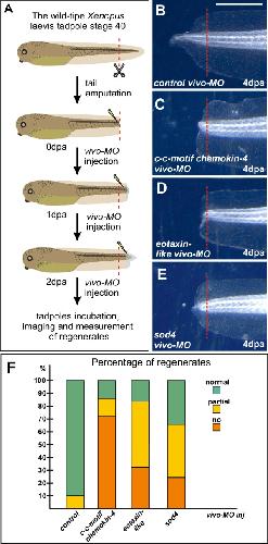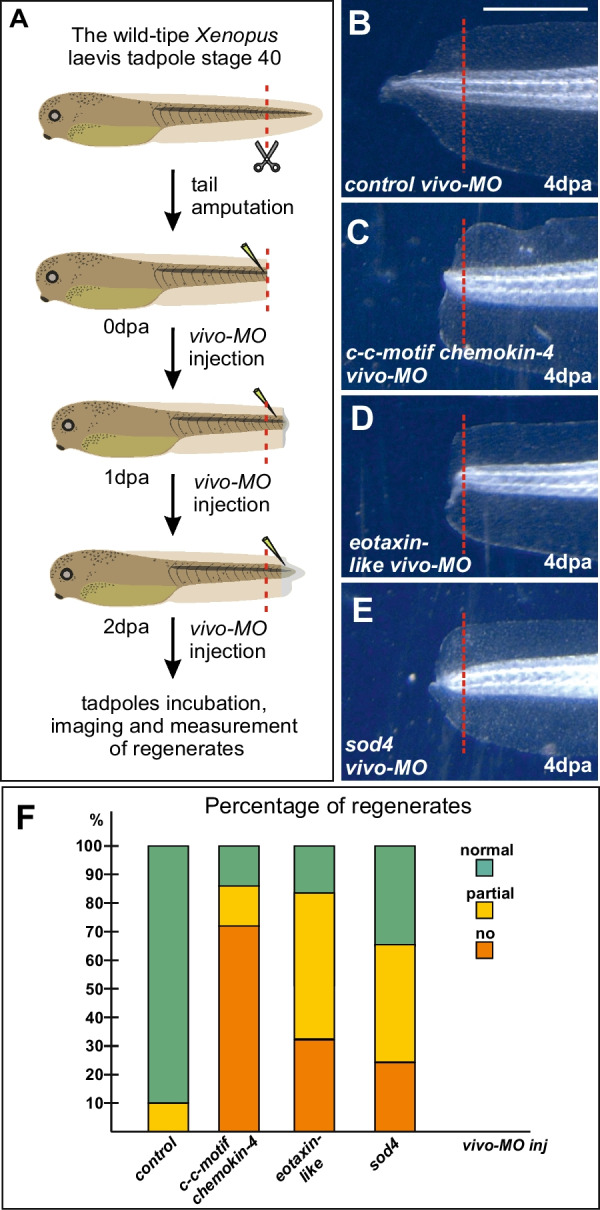 Fig. 7. The effect of vivo-MO-induced knockdown of c-c motif chemokine 4, eotaxin-like, and sod4 on the regeneration of the amputated Xenopus laevis tadpole tail. A Schema of experiments. Tail stumps were successively injected at 0, 1 and 2 dpa with either control vivo-MO or with vivo-MO to mRNA of each of the aforementioned three genes. The level of amputation is shown by red line. B–E Typical samples of tails of Xenopus laevis tadpoles injected with the indicated vivo-MO at 4th day after amputation. The level of amputation is shown by red line. F Percent distribution of three types of the regenerating tails of Xenopus laevis tadpoles (normal regeneration, partial and no regeneration) among the 4 dpa tails injected with the control vivo-MO and vivo-MOs to c-c motif chemokine 4, eotaxin-like, and sod4 mRNA. Common scale bar for B–E of 300 microns is shown in B
