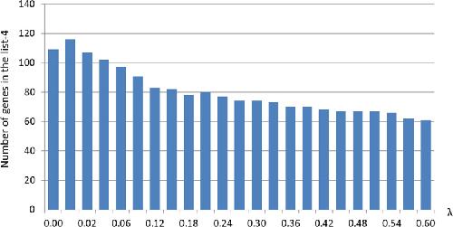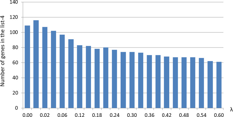\begin{document}$$\lambda$$\end{document}λ from 0.02 to 0.42, the number of genes in the list decreases from 107 to 68. When \documentclass[12pt]{minimal}