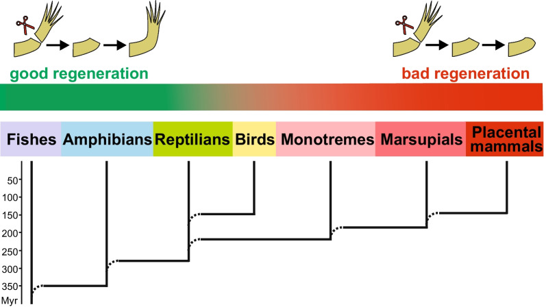 Fig. 1. Declining capability to regenerate large body appendages, i.e., limbs and tail, in the line of vertebrates from fish and amphibians to placental mammals. Shown are groups of vertebrates that emerged sequentially in evolution. Some extant species from these groups were collected into the lower, middle, and upper species sets to search for genes absent in reptiles, birds, and mammals but involved in tadpole tail regeneration in Xenopus tropicalis, which was chosen as the reference species R (see main text for details)