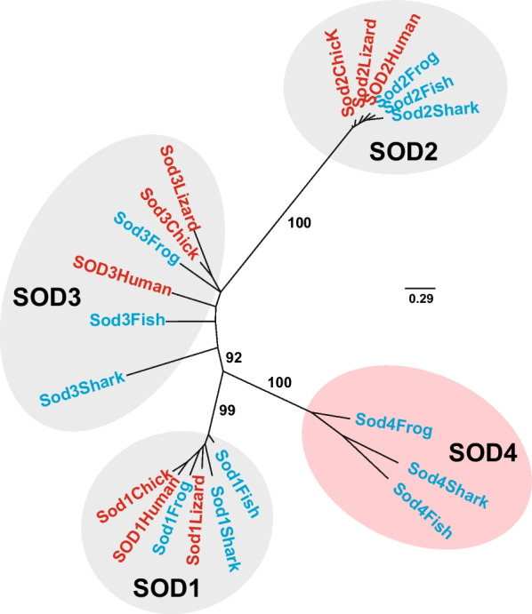 Fig. 5. Unrooted phylogenetic tree of SOD1, SOD2, SOD3, and SOD4 family proteins in the following jawed vertebrates: shark (Callorhinchus milii), bony fish (Danio rerio), frog (Xenopus tropicalis), lizard (Gekko japonicus), chicken (Gallus gallus) and human (Homo sapiens). Protein alignment and phylogenetic tree were built using MAFFT v7.511 [27] and IQ-TREE v2.2.0 [25, 44] tools for proteins under the following accessions: AFM87136.1 for Sod1Shark, NP_571369.1 for Sod1Fish, NP_001016252.1 for Sod1Frog, XP_015271096.1 for Sod1Lizard, NP_990395.2 for Sod1Chick, CAG46542.1 for SOD1Human, NP_001279581.1 for Sod2Shark, NP_956270.1 for Sod2Fish, NP_001005694.1 for Sod2Frog, XP_015268482.1 Sod2Lizard, NP_989542.2 for Sod2Chick, NP_001019636.1 for SOD2Human, AFM90279.1 for Sod3Shark, XP_001332758.1 for Sod3Fish, NP_001106630.1 for Sod3Frog, XP_015272245.1 for Sod3Lizard, XP_040525137.1 for Sod3Chick, CAG46651.1 for SOD3Human, XP_042193029.1 for Sod4Shark, XP_001343650.5 for Sod4Fish, and XP_017953150.2 for Sod4Frog. The branch support values were calculated using the ultrafast bootstrap approximation [43] with 1000 replicates