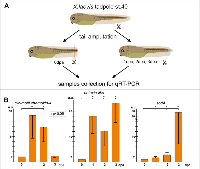 Fig. 6. Testing selected gene expression in Xenopus laevis tadpole tail regeneration. A Schema of experiments. The level of tail amputation is shown by red dotted line. B Results of qRT-PCR analysis of the expression of three genes selected from the final list in cells of tip of the amputated tail stump