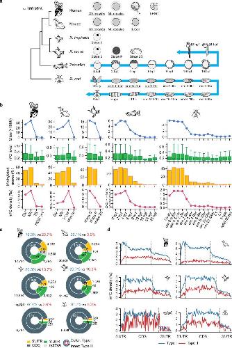 Fig. 3: Cis-regulatory innovation leads to the gain of 5' end Type I sites in higher animals. a Venn diagram showing the overlaps of Type I sites identified in wild-type HeLa cells and NSUN2 knockout HeLa cells expressing human, mouse, and zebrafish NSUN2 individually. Only sites that are covered by at least 20 reads in all samples were analyzed. The number of Type I sites overlapped with HeLa or human NSUN2 against the total number of Type I sites methylated by mouse or zebrafish NSUN2 was shown in parentheses. b The distribution of Type I m5C sites in NSUN2 knockout HeLa cells expressing human, mouse, and zebrafish NSUN2 individually. The density was first calculated as in Fig. 1d and then normalized to the bin with the highest density. c The relationship between maternal m5C density and GC content of the transcriptome. In this analysis, each maternal m5C site was binned as in Fig. 1d and the m5C density and GC content of each bin was calculated and plotted. Type I and Type II sites were calculated separately and Pearson correlation coefficient of determination is indicated. d Metagenomic analysis of GC contents in different species. With the investigation of more representative vertebrate species, we found that the 5' end high GC content was obtained in the common ancestor of birds and mammals. Source data are provided as a Source Data file. |