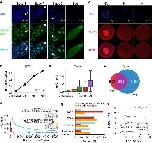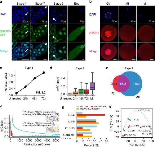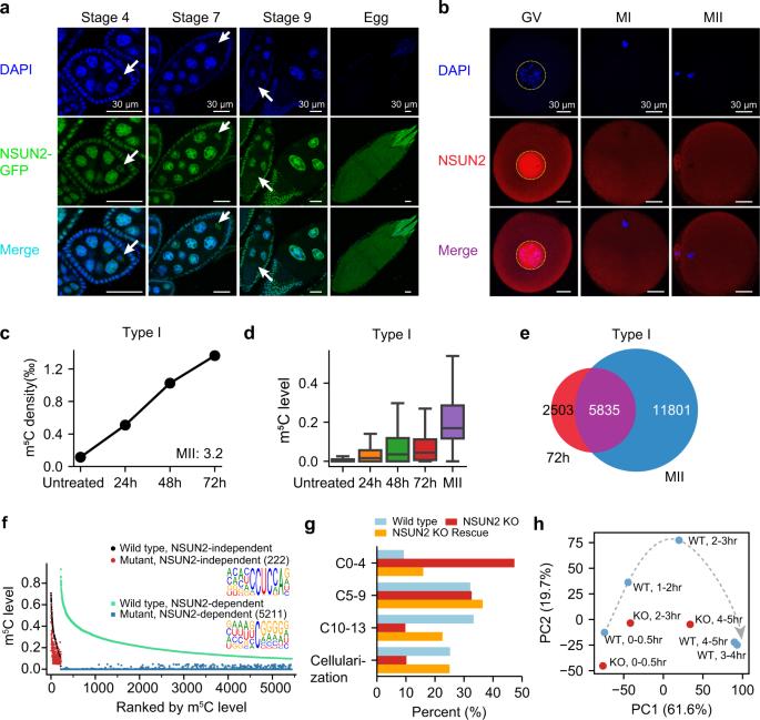 Fig. 2: The deposition of mRNA m5C in oocytes and the in vivo functions of NSUN2 in early embryogenesis. a Representative images of egg chambers at different stages for D. mel expressing a GFP-NSUN2 fusion protein under the control of its native promoter. DNA was stained with DAPI (blue). Arrows indicate the germ cell that will become the oocyte. The localization of NSUN2 was consistent in all samples of each stage (n = 12, 14, 17, 20). Scale bars, 30 μm. b Representative images of human GV/MI/MII oocytes stained with anti-NSUN2 antibody. 11 GV, 14 MI, and 14 MII oocytes were stained, and the NSUN2 localization was consistent in all oocytes examined. Scale bars, 30 μm. c, d The densities (c) and levels (d) of Type I m5C sites in HeLa cells treated with nocodazole for 0, 24, 48, and 72 h (1 sample per time point). In panel d, a union of sites with levels ≥10% in at least one sample was used for analysis (n = 5039). The density of mRNA m5C sites in MII oocytes is indicated in c. Boxplots: 25th to 75th percentiles (boxes), medians (horizonal lines), and 1.5 times of the interquartile range (whiskers). e Overlaps of Type I mRNA m5C sites between HeLa cells treated with nocodazole for 72 h and MII oocytes. f Comparison of m5C methylation levels in the ovaries between wild-type flies and NSUN2 knockout flies. Type I and Type II m5C sites were shown separately. g Quantification of the percentage of 0–2 h embryos that were in different stages of embryogenesis. Embryos were grouped into four stages: within four cleavage cycles, 5–9 cycles, 10-13 cycles, cellularization (as shown in Supplementary Fig. 9c). The first independent experiment on mutant #1 line was shown. The numbers of flies used are provided in Source Data. h PCA showing the first two PCs, which together explain 82.6% of the variance in the transcriptome data. The amount of variance explained by each PC is indicated on each axis. Wild-type and maternal NSUN2 knockout embryos are colored blue and red, respectively. Source data are provided as a Source Data file. |