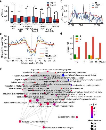Fig. 4: Trans-regulatory innovation leads to the gain of thousands of human-specific Type II sites. a Comparison of the levels of Type I and Type II sites in selected samples that represent maternal mRNA methylation status in different species and in hESC H1 that represents human zygotic mRNA methylation status. Note that in mouse oocyte samples, only 3.9% of the sites were Type II sites. Boxplots: 25th to 75th percentiles (boxes), medians (horizonal lines), and 1.5 times of the interquartile range (whiskers). The P-values were calculated using one-sided Student’s t-test. ****p < 0.0001; ns, not significant. From left to right: Type I sites: 26625, 19652, 15994, 14554, 4557, 4907, 312; Type II sites: 8388, 1042, 2530, 1679, 138, 482, 125; P-values: 2.61e-151, 0.184, 1.18e-6, 0.527, 0.931, 0.93, 0.914. b The distribution of Type II m5C sites in human MII oocytes, hESC H1, and human TE. The density was first calculated as in Fig. 1d and then normalized to the bin with the highest density. c The metaprofiles of the secondary structure of Type II m5C sites and flanking regions in human MII oocytes, hESC H1, human TE, and mouse MII oocytes. d Base composition at position +3 of the core motif for Type II sites in human MII oocytes, hESC H1, human TE, and mouse MII oocytes. e Enrichment map plot (see Methods) for genes that were only regulated by NSUN6 in human MII oocytes. The top 30 terms were shown. Source data are provided as a Source Data file. |