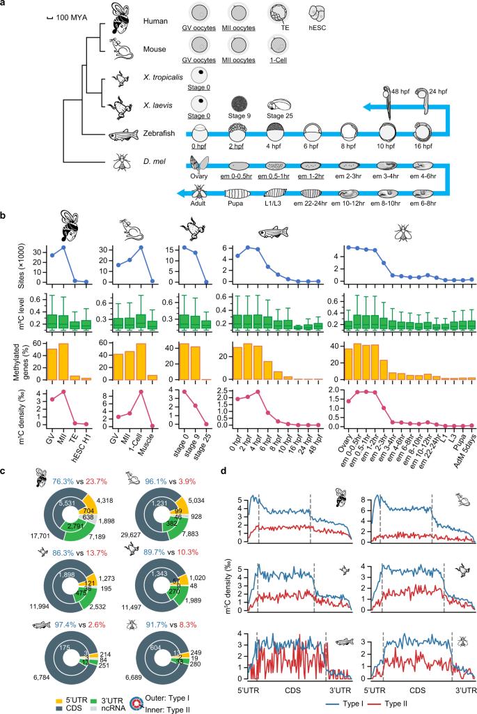 Fig. 1: Maternal mRNAs are methylated to an unprecedented extent in both vertebrate and invertebrate species by NSUN2 and NSUN6. a Phylogenic tree (left) and sampled developmental stages of the species in this study (right). The mammals separated from frogs, zebrafish, and D. mel about 352, 435, and 797 mya, respectively34. The divergence between humans and mice is estimated to be 90 mya and the divergence of the two frog species is estimated to be 57 mya34. Stages in which mRNAs were largely transcribed from the maternal genome are underlined. For humans and mice: GV germinal vesicle, MII Metaphase II, TE trophectoderm, hESC human embryonic stem cell, 1-cell 1-cell embryo. For zebrafish: hpf, hours post-fertilization. For D. mel: em embryo, L larva, hr hour. Zebrafish embryo images were adapted from Webb et al., 2006;63 adult zebrafish images were adapted from Kimmel et al.,1995;64 fly ovary image was adapted from AVILéS et al., 2018;65 other fly sample images were adapted from Wolpert et al., 201566. b The number and methylation level of m5C sites, the percentage of transcribed genes with m5C sites, and the density of m5C sites in the samples we profiled. The density was defined as the number of m5C sites per thousand Cs that are covered by at least 20 reads. The mouse muscle sample that has the highest m5C level in adult tissues29 was selected to represent the zygotic mRNA m5C pattern. AdM, adult male; H1, hESC H1 line. Boxplots: 25th to 75th percentiles (boxes), medians (horizonal lines), and 1.5 times of the interquartile range (whiskers). The number of data points are provided in Source Data. Numbers of biological replicates are provided in Supplementary Fig. 1. c Genic locations of maternal m5C sites in each species. The number of m5C sites and the percentages of Type I and Type II sites are indicated. d The distribution of maternal m5C sites along the transcripts in different species. In this analysis, each m5C site was binned and the m5C density of each bin was calculated (Methods). Bin numbers were based on average lengths among transcripts in different species. Bin numbers (5'UTR:CDS:3'UTR): humans, 10:50:40; mice, 10:60:50; X. tropicalis, 10:60:40; X. laevis, 10:60:30; zebrafish, 10:80:30; D. mel, 10:60:20. Source data are provided as a Source Data file. |