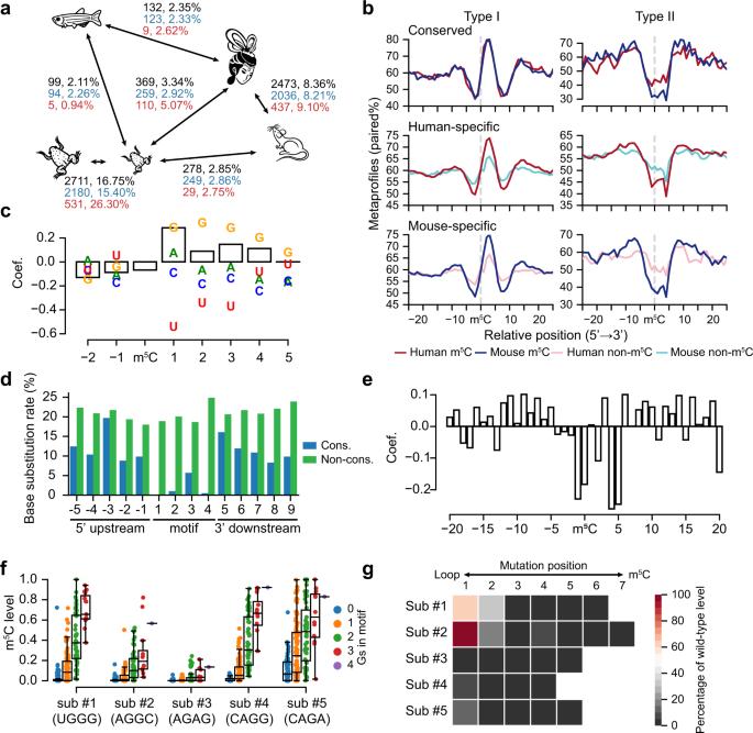 Fig. 5: Sequence- and structure- dependent evolution of mRNA m5C. a Pairwise comparison showing the numbers and percentages of conserved m5C sites between vertebrate species. The lengths of lines are proportional to the divergence times between species. The numbers and percentages of all m5C sites (black), Type I m5C sites (blue), and Type II m5C sites (red) were shown separately. Samples used: humans and mice, MII oocytes; frogs, stage 0; zebrafish, 0 hpf; fly, 0–0.5 h embryos. Conserved methylation sites, m5C sites with a level ≥10 % in one species and with a level >5% in another species. Only conserved Cs covered by at least ten reads in both species were considered. b The metaprofiles of the secondary structure for conserved and non-conserved Type I and Type II m5C sites between humans and mice. Conserved, m5C sites that were methylated in both species. Human-specific or mouse-specific, m5C sites that were Cs at the DNA level in both species but only methylated in humans or mice. Samples used: human and mouse MII oocytes. c GLM coefficients of sequence and structural factors for the gain or loss of Type I sites between humans and mice (see Methods). Coefficients of the bases were shown in characters and coefficients of the structures were shown in bars. d Base substitution rates in the motif and flanking regions of conserved and non-conserved Type II sites between humans and mice. e GLM coefficients of structural features for the gain or loss of Type II sites between humans and mice. Bars on the positive Y-axis indicate that the paired status of that base is a positive factor for methylation. f The relationship between the numbers of Gs in the motifs of five Type I substrates and their m5C levels. All 256 types of motifs were tested. For each motif, the base-pairing status was maintained by the introduction of compensatory mutation. Sub, substrates. Boxplots: 25th to 75th percentiles (boxes), median (horizonal line), and 1.5 times of the interquartile range (whiskers). Numbers of data points are provided in Source Data. g The relationship between point mutations in the stems of 5 Type I substrates and their m5C levels. The position of each mutation in 5 Type I substrates was shown in Supplementary Fig. 13e. Source data are provided as a Source Data file. |
