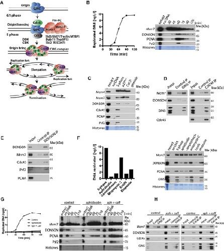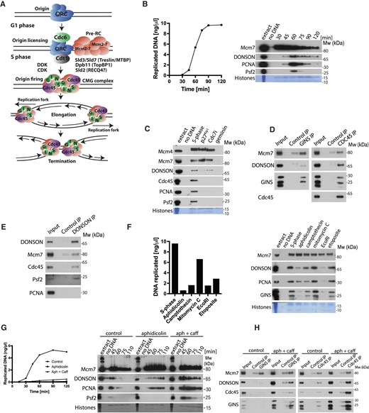 Figure 1. DONSON interacts with replisome on replicating chromatin in Xenopus laevis egg extract. (A) Model of eukaryotic DNA replication. S. cerevisiae initiation factors are listed with human homologues names in brackets. (B) DNA replication was set up in Xenopus egg extract and synthesis of nascent DNA followed by incorporation of α32P-dATP into newly synthesised DNA (left). At the same indicated times chromatin was isolated and chromatin bound factors resolved on SDS-PAGE and immunoblotted with indicated antibodies (right). ‘No DNA’ control served as chromatin specificity control, while Coomassie stained histones from the bottom of the gel serve as a loading and purity control. (C) Replication reaction was set up in egg extract in optional presence of indicated replication initiation inhibitors. Chromatin fractions were isolated in the middle of S-phase and analysed by immunoblotting as in (B). (D) Chromatin replicating in egg extract was isolated in the middle of S-phase, chromatin bound protein complexes were released from chromatin by digestion of DNA with benzonase and replisomes immunoprecipitated using α-Cdc45 or α-GINS specific antibodies. Non-specific commercial IgG antibodies served as non-specific control. Input and immunoprecipitated samples were resolved on SDS-PAGE and immunoblotted with indicated antibodies. (E) Chromatin was prepared as in (D), but immunoprecipitation was carried out with α-DONSON antibody. (F) Replication reaction was set up in egg extract and treated optionally with indicated replication stress and DNA damaging agents. Chromatin was isolated after 60 min of reaction progression (middle/late stage of replication) and immunoblotted with indicated antibodies as in (B) (right), while the ability of the extract to synthesise nascent DNA was assessed after 90 min of replication reaction progression (left). (G) Replication reaction was set up in egg extract and optionally supplemented with aphidicolin and caffeine, as indicated. Progression of DNA synthesis during replication reaction was analysed (left), while chromatin bound factors were analysed by immunoblotting as in (B) (right). (H) Chromatin replicating in egg extract in optional presence of aphidicolin and caffeine was isolated, chromatin protein complexes released by DNA digestion and Cdc45 or GINS immunoprecipitated as in (D).