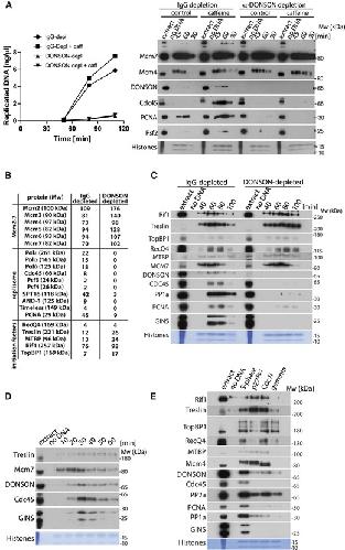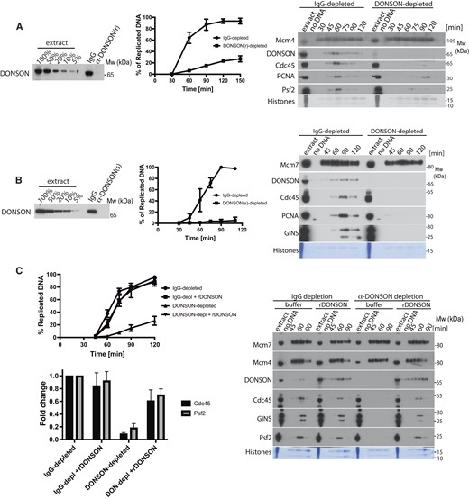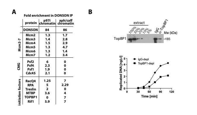 and non-specific control and DONSON(s) antibodies used for immunoprecipiatation. The fold enrichment of presented replication fators in DONSON IP over nonspecific conrol IP was coalculated and is preseneted. (B) TopBP1 was immunodepleted from egg extract. The efficiency of immunodepletion was analysed by western blotting against titration of original egg extract (top) and the ability of the immunodepleted extract to