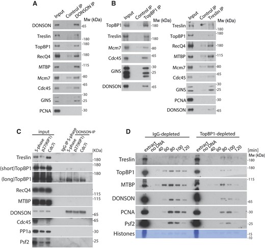 Figure 4. DONSON interacts with replication initiation factors. (A) Chromatin replication reaction was carried on in presence of aphidicolin and caffeine. Chromatin was isolated after 60 min of replication reaction, protein complexes were released from chromatin by digestion of DNA with benzonase and non-specific control antibodies or α-DONSON(s) antibodies used for immunoprecipitation. The input and immunoprecipitated samples were analysed by immunoblotting with indicated antibodies. (B) As (A) but α-TopBP1 or α-Treslin antibodies were used for immunoprecipitation. (C) DNA replication reaction was set up in egg extract with optional addition of replication initiation inhibitors (p27KIP1 or Cdc7i). In the middle of S-phase, replicating nuclei were isolated in a buffer without detergent, which allows to retain part of the nucleoplasm. From this input material, DONSON was immunoprecipitated and immunoprecipitation samples analysed by immunoblotting with indicated antibodies. As a control, non-specific antibody immunoprecipitation from unchallenged S-phase input was performed in parallel. (D) TopBP1 was immunodepleted from egg extract to 25% of the original level. Replication reaction was set up in IgG- and TopBP1-depleted extract and chromatin isolated at indicated times of reaction and chromatin fractions analysed as above.