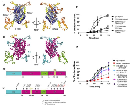DONSON 3D structure organisation. (A) AlphaFold prediction of DONSON 3D structure. High confidence prediction in blue, low confidence prediction in yellow/orange. (B, C) Based on the predicted structure DONSON can be divided into six domains—N-terminal D1 domain which is unstructured, structured D2, flexible loop D3, structured D4 and D6 with a short turn motif D5. The 1D model of DONSON with colour coded domains (C) and 3D representation of these domains separation (B). (D) Mapping of the disease mutations described in (48) on human DONSON structure. Meier-Gorlin, Microcephalic Primordial Dwarfism MPD syndrome and Neu-Laxova syndrome mutations are mapped. The mutations marked in red do not have Xenopus homologous sequence. (E) DONSON mutant lacking unstructured N-terminus (DONSONΔN) or the flexible loop D3 from (B), (DONSONΔloop), was purified (Supplementary Figure 3C) and tested for rescue of DONSON-depleted egg extract in its ability to synthesise nascent DNA. (F) Indicated point mutants of DONSON (Xenopus DONSON with mutations homologous to patient derived human mutations) were purified (Supp Figure 3C) and tested as in (E).