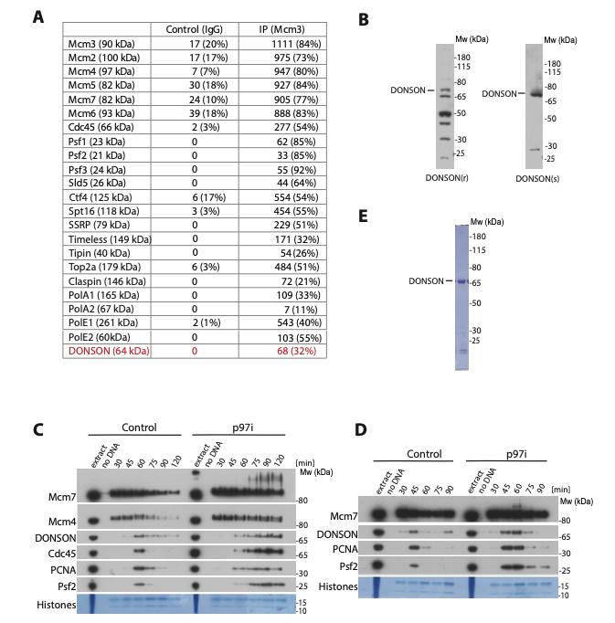 Supp Figure 1. DONSON interacts with terminated replisomes. (A) DNA replication reaction was established in Xenopus laevis egg extract supplemented with inactive mutant of p97 segregase and MLN4924 cullin E3 ligase inhibitor to block disassembly of replisomes in S-phase (as described in Sonneville et al 2017). Chromatin containing retained terminated replisomes was isolated, fragmented with benzonase and Mcm3 immunoprecipitaed. Proteins interacting with Mcm3 were analysed by mass spectrometry. Total spectral count and percentage coverage is presented for selected replisome components. (B) Polyclonal rabbit and shhep antibodies were raised against recombinant X.l.DONSON purified from bacteria. Protein band corresponding to DONSON within egg extract is ndicated. (C) Replicaton reaction was set up in egg extract supplemented with p97i NMS932 and chromatin isolated at indicated times. Chromatin samples were analysed by western blotting with indicated antibodies as in Figure 1. (D) As in (C) but the replication reaction