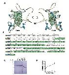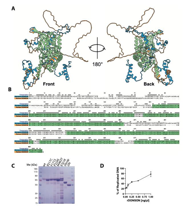 Supp Figure 3. Conservation of DONSON structure (A) AlphaFold overlay of 3D structure of Xenopus DONSON (blue) and human DONSON (orange). Overlapping structure in green. (B) Comparison of XenopusDONSON (blue) and human DONSON (orange) primary sequences. Conserved sequence in green.