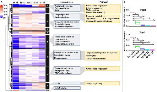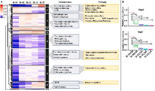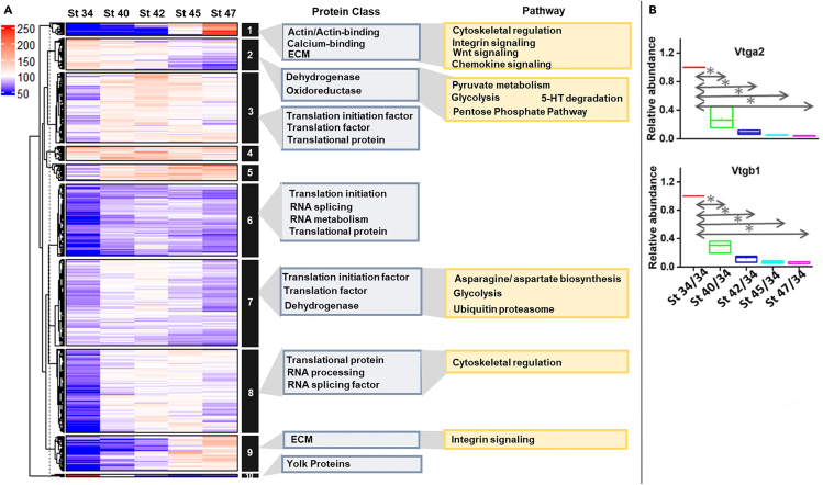 Figure 3. Temporal proteome dynamics during otic development(A) Hierarchical clustering analysis supplemented by k-means clustering, cluster numbers indicated in adjoining black bars. Overrepresented GO categories for dynamic clusters for protein class (blue) and pathway (yellow) are shown.(B) Relative quantification of yolk protein fragments Vtga2 and Vtgb1 over developmental stages when maternal yolk proteins are metabolized. ∗, p < 0.05 (ANOVA). See also Table S1. |