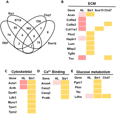 Figure 5. Dynamically expressed proteins overlap with putative downstream targets of CHL genes (AE) (A) Venn diagrams show overlap between dynamically expressed proteins (DEPs) and BOR (Six1), CHARGE (Chd7) and Waardenburg (Sox10) associated genes (BE) Dynamically regulated ECM (B), cytoskeletal (C), calcium binding (D), and glucose metabolism (E) proteins that are putative downstream targets of CHL genes. Filled pink boxes are based on human data whereas the hatched pink boxes are based on mouse knockout data. Yellow boxes indicate genes in these categories found in the datasets analyzed in A. See also Table S2. |