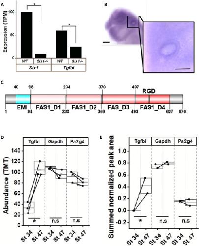 Figure 6. Characterization of Tgfbi expression (A) Tgfbi is a putative downstream target of Six1. RNA-seq of E10.5 mouse OVs from Six1+/+ and Six1/ embryos was done to evaluate gene expression changes in the absence of Six1. Expression of Tgfbi significantly decreased in Six1-null OVs compared to wild type (WT) OVs of littermates (, p < 0.05). (B) Expression pattern of Tgfbi as assessed by in situ hybridization at stage 32 (lateral view). Bar indicates 200 m. Inset shows Tgfbi expression in otic vesicle. Bar indicates 100 m. (C) Xenopus laevis Tgfbi contains one EMI domain, four FAS1 domains and the RGD motif. (source Uniprot). Domain visualization generated using DOG (version 2).48 Numbers indicate amino acid residues. (D) Label based (TMT) abundance for Tgfbi, Gapdh, and Pa2g4 between stage 34 and 47 otic vesicles (paired Students t test for unequal variance, , p < 0.05). (E) Summed and normalized peak intensities for Tgfbi, Gapdh, and Pa2g4 between stage 34 and 47 otic vesicles (paired Students t test for unequal variance, , p < 0.05). n.s., not significant. |
