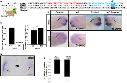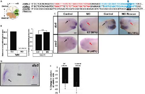 Figure 7. Loss-of-function experiments for tgfbi in the context of otic development (A) Xenopus 16-cell blastomeres that are fated to primarily contribute to neural crest (NC) and pre-placodal ectoderm (PPE) are labeled in green, and were microinjected with antisense morpholino oligonucleotides (MO) with or without mRNA encoding human TGFBI to which the MOs do not bind. Left (L) and right (R) sides of embryo. Uninjected half of the embryo was used as control for phenotype assessment. In the right panel, sequences of the two alleles of Xenopus laevis tgfbi on the long (.L) and short (.S) chromosomes and human TGFBI are aligned. Red and blue regions indicate sites for MO binding, blue arrow marks the translation start site (ATG). hTGFBI 5 sequence cannot bind the MOs and therefore could be used to rescue the effects of the MOs. (B and C) Targeted MS analysis shows Tgfbi protein is not detected in OVs dissected from the MO injected sides of stage 34 larvae. Abundance of the reference protein Gapdh does not change significantly following Tgfbi KD (paired Students t test, p > 0.05) (C) MO injected embryos cultured to stage 32 and processed by ISH for dlx5 and pax2. While OV gene expression was normal on the control side (black arrow), it was greatly reduced on the MO-injected side (red arrow) of same larva in a large percentage of the cases (n = 63 larvae for dlx5, n = 39 larvae for pax2). Embryos injected with Tgfbi MOs plus the MO-insensitive human TGFBI mRNA showed a significantly reduced percentage of reduced dlx5 expression (p < 0.05, Chi-Squared test), demonstrating rescue of the morphant phenotype. MO: morpholino injection; MO Rescue: MOs + hTGFBI mRNA injection. Bar indicates 200 m. (D) Larvae were vibratome sectioned to measure OV and luminal volumes. In the image shown, dlx5 expression was reduced in the OV on the MO injected side (red arrow) compared to the control side (black arrow). hb, hindbrain. (E) Otic and luminal volumes of MO injected sides represented as percent change in otic volume compared to control (uninjected) sides of the same larvae (paired Wilcoxon signed rank test, , p < 0.05, Data are represented as mean SEM). |