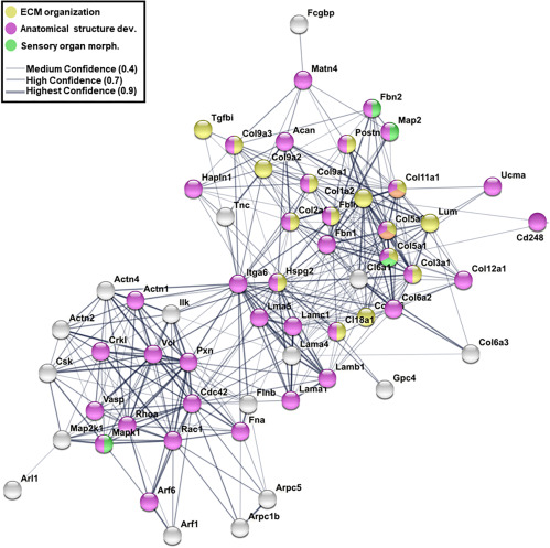Figure 4. Integrin and ECM protein interaction networks STRING analysis and pathway enrichment analysis using the Xenopus interaction database show enrichment of processes related to ECM organization (yellow), anatomical structure development (pink), and sensory organ development (green). Interactions among proteins are reported with medium to highest confidence represented by thickness of lines. |