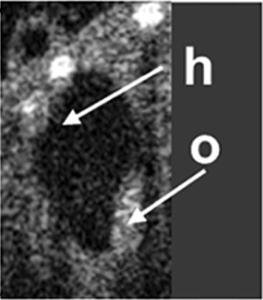 optical coherence tomography-based images of the otic vesicle in X. laevis embryo at NF stage 45/46, in which the protrusions that will form the horizontal canal grow further inward and stereocilia bundles on hair cells are very distinct (5 m in length). [key Otolith (o), pouch and protrusions for the horizontal canal (h); scale bar = 100um] |