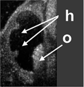 Optical coherence tomography-based images of the otic vesicle in X. laevis embryo at NF stage 42/43, containing pouches in the pars superior that presage the horizontal, anterior, and posterior semicircular canals. [key: Otolith (o), pouch and protrusions for the horizontal canal (h); scale bar =100um] |