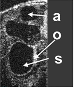 optical coherence tomography-based images of the otic vesicle in X. laevis embryo at NF stage 47, in which the axial protrusions are fused to form the horizontal, anterior, and posterior semicircular canals and the sensory patches in the sacculus, utricle, semicircular canals, and auditory lagena are recognizable and stereocilia bundles are established. [Key: Otolith (o), anterior canal (a), sacculus (s). Bar indicates 100 m] |