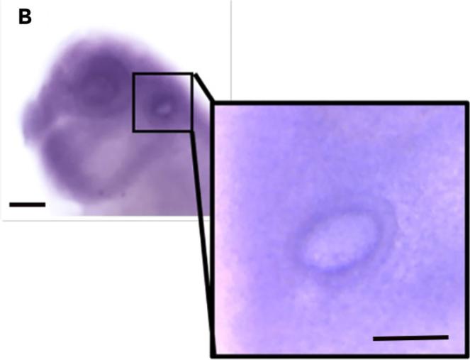 tgfb1 (transforming growth factor beta induced) gene expression in X. laevis embryo, as assessed by in situ hybridization at NF stage 32, lateral view of head region, anterior left, dorsal up, with inset showing otic vesicle. |