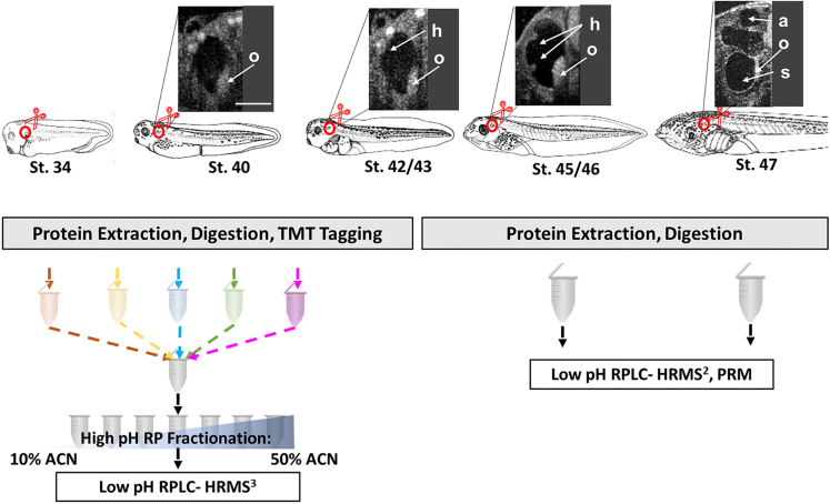 Figure 1. Workflow for time-resolved proteome analysis of otic morphogenesis Xenopus larvae and tadpoles from stages 3447 were selected for otic proteome analysis. These stages were chosen because they include the simplest structure displaying onset of tubular duct growth (st 34), the initial polarization and compartmentalization of the OV into distinct functional regions and the appearance of otoliths (st 40), the onset of semicircular canal formation (st 42/43), the onset of sensory hair cell formation (st 45) and the completion of semicircular canal formation, sensory patch formation and hair cell differentiation (st 47). Insets show stage associated optical coherence tomography-based images of the otic vesicle. Otolith (o), pouch and protrusions for the horizontal canal (h), anterior canal (a), sacculus (s). Bar indicates 100 m. Otic vesicles were dissected and processed using a bottom-up proteomic workflow. Peptides were tagged with isobaric mass tags to quantify relative changes in protein abundances during the course of otic morphogenesis. Tagged peptides were fractionated offline using RP spin columns at a high pH and then analyzed by LC-HRMS. Quantification of select proteins was verified using targeted (PRM) HRMS. |