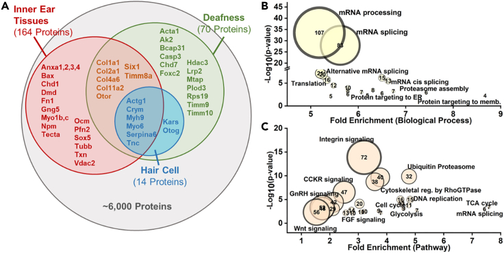Figure 2. Characterization of the global proteome (A) Approximately 6,000 proteins were identified from otic tissues across all analyzed developmental stages and the five biological replicates. Proteins correlated with publicly available proteomic and transcriptomic datasets from inner ear tissues. A number of proteins previously reported in inner ear tissues (red) and hair cells (blue) were included in our dataset. Additional proteins correlated with deafness genes reported on OMIM (green). (B) Over-representation analysis (PantherDB) for biological processes demonstrating a fold enrichment >5 indicated an enrichment of processes such as mRNA processing and splicing in the otic proteome. (C) Over-representation analysis (PantherDB) for pathways demonstrated an enrichment in pathways such as Integrin, Wnt, and FGF signaling. |