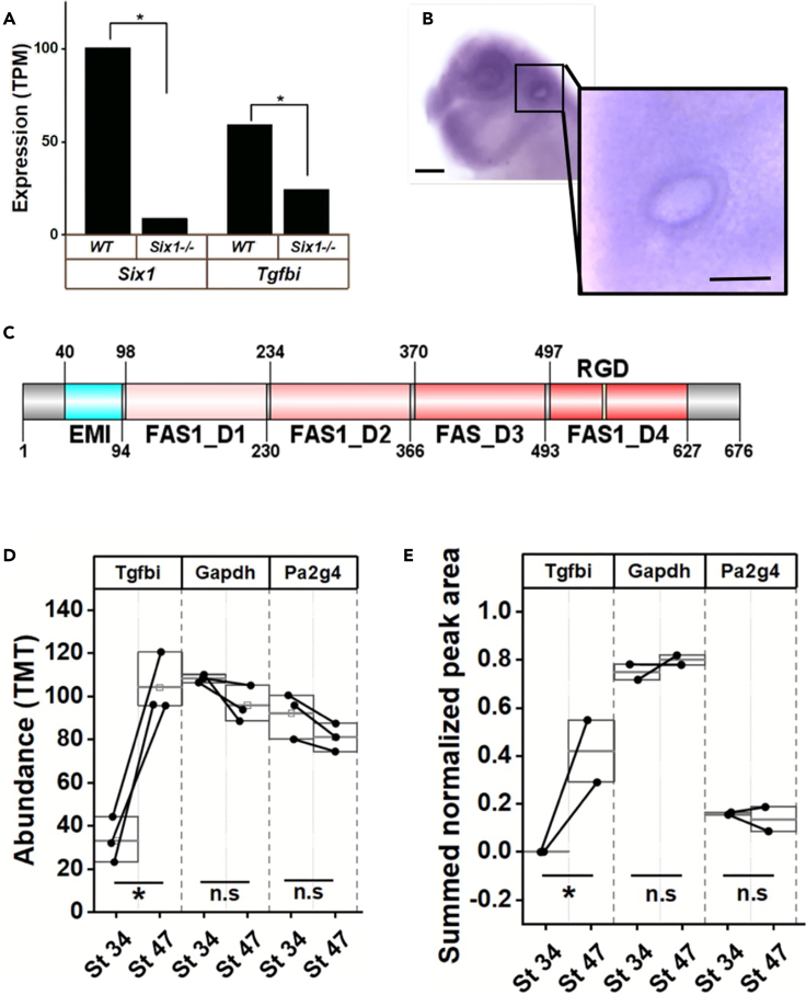 Figure 6. Characterization of Tgfbi expression(A) Tgfbi is a putative downstream target of Six1. RNA-seq of E10.5 mouse OVs from Six1+/+ and Six1−/− embryos was done to evaluate gene expression changes in the absence of Six1. Expression of Tgfbi significantly decreased in Six1-null OVs compared to wild type (WT) OVs of littermates (∗, p < 0.05).(B) Expression pattern of Tgfbi as assessed by in situ hybridization at stage 32 (lateral view). Bar indicates 200 μm. Inset shows Tgfbi expression in otic vesicle. Bar indicates 100 μm.(C) Xenopus laevis Tgfbi contains one EMI domain, four FAS1 domains and the RGD motif. (source Uniprot). Domain visualization generated using DOG (version 2).48 Numbers indicate amino acid residues.(D) Label based (TMT) abundance for Tgfbi, Gapdh, and Pa2g4 between stage 34 and 47 otic vesicles (paired Student’s t test for unequal variance, ∗, p < 0.05).(E) Summed and normalized peak intensities for Tgfbi, Gapdh, and Pa2g4 between stage 34 and 47 otic vesicles (paired Student’s t test for unequal variance, ∗, p < 0.05). n.s., not significant. |