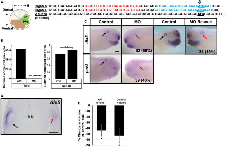 Figure 7. Loss-of-function experiments for tgfbi in the context of otic development(A) Xenopus 16-cell blastomeres that are fated to primarily contribute to neural crest (NC) and pre-placodal ectoderm (PPE) are labeled in green, and were microinjected with antisense morpholino oligonucleotides (MO) with or without mRNA encoding human TGFBI to which the MOs do not bind. Left (L) and right (R) sides of embryo. Uninjected half of the embryo was used as control for phenotype assessment. In the right panel, sequences of the two alleles of Xenopus laevis tgfbi on the long (.L) and short (.S) chromosomes and human TGFBI are aligned. Red and blue regions indicate sites for MO binding, blue arrow marks the translation start site (ATG). hTGFBI 5′ sequence cannot bind the MOs and therefore could be used to rescue the effects of the MOs.(B and C) Targeted MS analysis shows Tgfbi protein is not detected in OVs dissected from the MO injected sides of stage 34 larvae. Abundance of the reference protein Gapdh does not change significantly following Tgfbi KD (paired Student’s t test, p > 0.05) (C) MO injected embryos cultured to stage 32 and processed by ISH for dlx5 and pax2. While OV gene expression was normal on the control side (black arrow), it was greatly reduced on the MO-injected side (red arrow) of same larva in a large percentage of the cases (n = 63 larvae for dlx5, n = 39 larvae for pax2). Embryos injected with Tgfbi MOs plus the MO-insensitive human TGFBI mRNA showed a significantly reduced percentage of reduced dlx5 expression (p < 0.05, Chi-Squared test), demonstrating rescue of the morphant phenotype. MO: morpholino injection; MO Rescue: MOs + hTGFBI mRNA injection. Bar indicates 200 μm.(D) Larvae were vibratome sectioned to measure OV and luminal volumes. In the image shown, dlx5 expression was reduced in the OV on the MO injected side (red arrow) compared to the control side (black arrow). hb, hindbrain.(E) Otic and luminal volumes of MO injected sides represented as percent change in otic volume compared to control (uninjected) sides of the same larvae (paired Wilcoxon signed rank test, ∗, p < 0.05, Data are represented as mean ± SEM). |