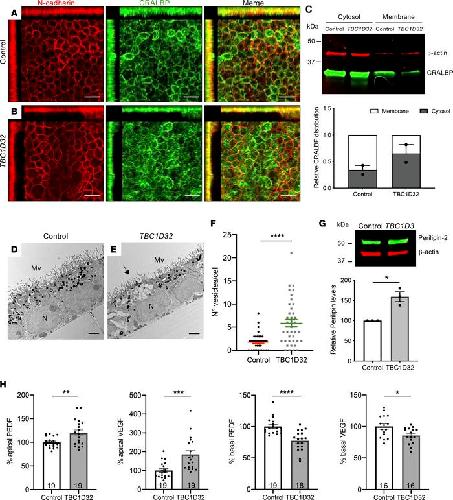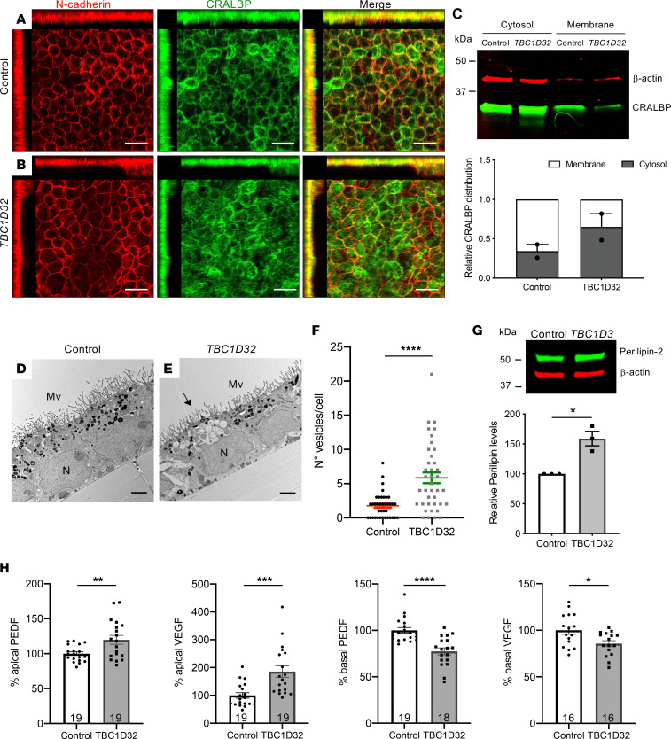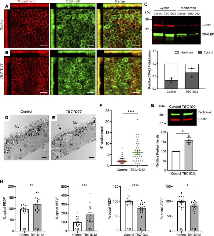 Figure 9/ Retinosome accumulation and altered secretion in human TBC1D32 iPSC-derived RPE. IF studies and MIP confocal imaging of control (A) and TBC1D32 (B) iPSC-derived RPE using antibodies directed against N-cadherin and CRALBP. Redistribution of N-cadherin and CRALBP can be seen on the orthogonal planes. Scale bars = 10 μm. (C) Representative Western blot analysis and quantification of 2 independent blots of CRALBP distribution in the cytosol versus membrane fractions of control and TBC1D32 iPSC-derived RPE relative to the β-actin loading control. Data represented as mean ± SEM. TEM of control (D) and TBC1D32 (E) iPSC-derived RPE showing apical microvilli (MV), basal nuclei (N), pigmented melanosomes, and vesicles corresponding to lipid droplets (black arrow). Scale bar = 2 μm. (F) Quantification of the number of vesicles per cell in control (n = 38 cells) and TBC1D32 (n = 39 cells) RPE. Data are represented as mean ± SEM; ****P < 0.0001; Student’s 2-tailed t test. (G) Representative Western blot analysis of perilipin expression and quantification relative to the β-actin loading control. Data represented as mean ± SEM. n = 3 blots; *P < 0.05; 2-tailed Mann-Whitney test. (H) ELISA of PEDF and VEGF secretion in apical and basal chambers of control and TBC1D32 RPE cultured on Transwell membrane inserts. Data are expressed as a percentage of control; *P < 0.05; **P < 0.01; ***P < 0.001; ****P < 0.0001; the number of samples are indicated within bars. Student’s 2-tailed t test. |