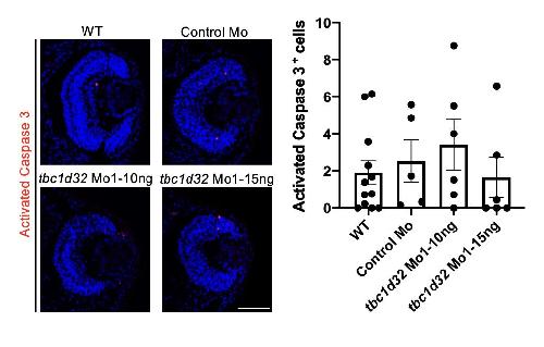 Supplemental Figure 5. Cell death assay in Xenopus embryos following tbc1d32 Mo injections. Activated caspase 3 immunolabelling on retinal sections of wild type embryos (WT), control embryos injected with a standard Mo (Control Mo), morphant embryos injected with 2 doses of tbc1d32 Mo (10 ng or 15 ng). Scatter plots with bars represents the mean number of activated caspase 3+ cells per section for each condition, each dot corresponding to one embryo. Data are represented as mean ± SEM. Scale bar = 40 μm. |
