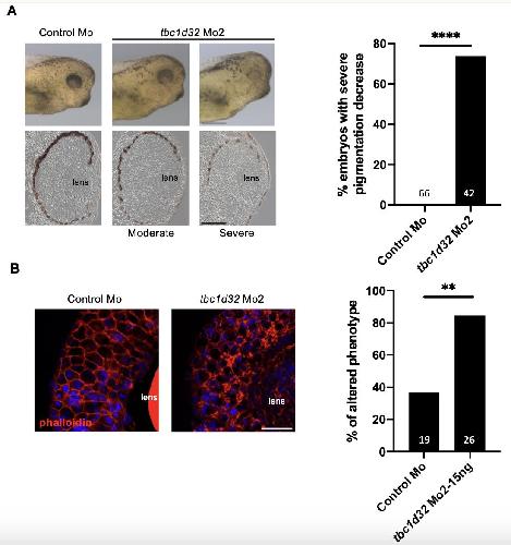 Supplemental Figure 6. Xenopus RPE phenotype in tbc1d32 Mo2 injected embryos. A) Upper panels, lateral views of the head of one control and two morphant embryos with moderate and severe phenotypes (anterior to the right). Lower panels, transverse retinal sections of control and morphant embryos (dorsal side up). The histogram represents the percentage of embryos with a severe decrease in pigmentation among control (control Mo), and morphant (tbc1d32 Mo2) groups. B) Phalloidin staining of filamentous actin on dissected eyes of control or Mo2 morphant Xenopus embryos at stage 35-36. The total number of embryos analyzed per condition is indicated in each bar. ****p<0.0001, **p<0.01; Fishers exact test. Scale bars = 400 um for whole mounts, 60 um for sections in A, and 20 m in B. |
