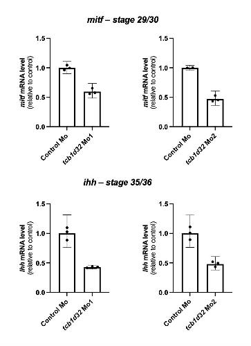 Supplemental Figure 8. Xenopus RPE marker expression following tbc1d32 knockdown. qPCR analysis of mitf and ihh expression, in optic vesicles at stage 29-30 and whole eyes at stage 35-36, respectively, injected with control Mo, tbc1d32 Mo1 or tbc1d32 Mo2 (15ng). Data are represented as geometric mean with 95% CI; n = 3 technical replicates. |