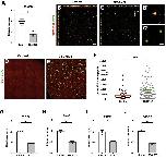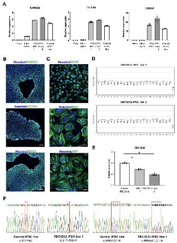 Supplemental Figure 12. Quality controls of TBC1D32 iPSC lines from Patient 1. A) qPCR analysis of the pluripotency markers NANOG, OCT3/4 and LIN28A in fibroblasts, fibroblasts transduced with Sendai reprogramming vectors (Fibro SeV+; light grey bars), TBC1D32 iPSC lines 1 and 2 (dark grey bars), and a control iPSC line (black bars). Data are represented as mean ± SEM. B) IF analysis of the pluripotency markers NANOG, OCT3/4 and SOX2 (in green; nuclei labelled in blue) in TBC1D32 iPSC line 1. Scale bars = 70 μm. C) IF analysis of the germline markers glial fibrillary acidic protein (GFAP; ectoderm), smooth muscle actin (SMA; mesoderm) and alpha-fetoprotein (AFP; endoderm), following EB differentiation of TBC1D32 iPSC line 2. Scale bars = 40 μm. D) Digital qPCR analysis of rearrangement hotspots in TBC1D32 iPSC lines showing a copy number of 2 for all autosomal regions, and a copy number of 1 for the X chromosome. E) qPCR analysis of TBC1D32 expression in TBC1D32 iPSC lines (grey bars) in comparison to a control line (black bar). Data are represented as mean ± SEM; n = 3 technical replicates; p<0.05; Mann and Whitney. F) Sanger sequencing of the regions carrying the variants c.317+5G>A and c.846delTCCTA (red boxes) in the TBC1D32 iPSC line 1 in comparison to a control iPSC line. |