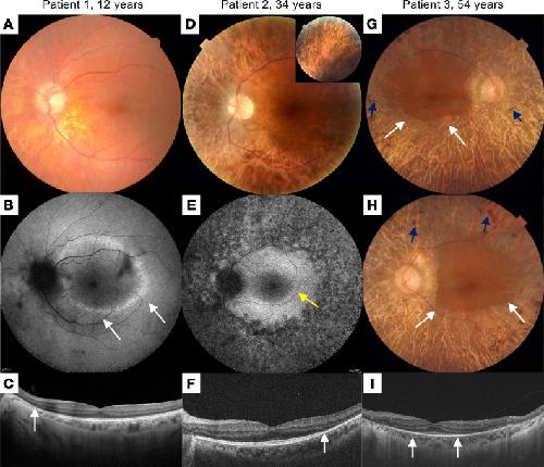Figure 1. Multimodal imaging of the patients.Patient 1: (A) Color fundus photograph showing pallor of the optic nerve head and reduced caliber of the retinal vessels. Note the abnormal visibility of the choroidal vessels due to RPE damage in the midperiphery. (B) Short-wavelength fundus autofluorescence (SW-FAF) showing a parafoveal ring characteristic of RP (white arrows). (C) SD-OCT macular scan showing preserved segmentation in the foveal area with peripheral loss of the ellipsoidal zone (EZ) line nasal to the fovea (white arrow). Patient 2: (D) Color fundus photograph showing increased choroidal visibility beyond the temporal vascular arcades. Inset: pigment accumulation in the superior retinal periphery. (E) SW-FAF showing a relatively preserved intensity within the macular region and loss of the signal beyond the temporal vascular arcades. An incomplete hyperautofluorescent ring is visible in the temporal parafoveal region (yellow arrow). (F) SD-OCT scan along the horizontal meridian through the fovea showing preservation of retinal layers in the central macula and gradual disappearance of photoreceptor layers with increasing eccentricity in the temporal direction. The white arrow indicates the beginning of the disappearance of the EZ line. Patient 3: (G and H) Color fundus imaging of both eyes showing peripheral retinal bone spicules (blue arrows), papillary pallor, and evident atrophy of the RPE-choriocapillaris complex except in the macular area (delineated by white arrows). (I) SD-OCT macular scan showing an EZ line only visible beneath the fovea (between white arrows). |