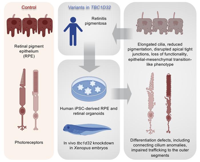 Retinitis pigmentosa (RP) is the most common inherited retinal disease (IRD) and is characterized by photoreceptor degeneration and progressive vision loss. We report 4 patients presenting with RP from 3 unrelated families with variants in TBC1D32, which to date has never been associated with an IRD. To validate TBC1D32 as a putative RP causative gene, we combined Xenopus in vivo approaches and human induced pluripotent stem cell-derived (iPSC-derived) retinal models. Our data showed that TBC1D32 was expressed during retinal development and that it played an important role in retinal pigment epithelium (RPE) differentiation. Furthermore, we identified a role for TBC1D32 in ciliogenesis of the RPE. We demonstrated elongated ciliary defects that resulted in disrupted apical tight junctions, loss of functionality (delayed retinoid cycling and altered secretion balance), and the onset of an epithelial-mesenchymal transition-like phenotype. Last, our results suggested photoreceptor differentiation defects, including connecting cilium anomalies, that resulted in impaired trafficking to the outer segment in cones and rods in TBC1D32 iPSC-derived retinal organoids. Overall, our data highlight a critical role for TBC1D32 in the retina and demonstrate that TBC1D32 mutations lead to RP. We thus identify TBC1D32 as an IRD-causative gene.
