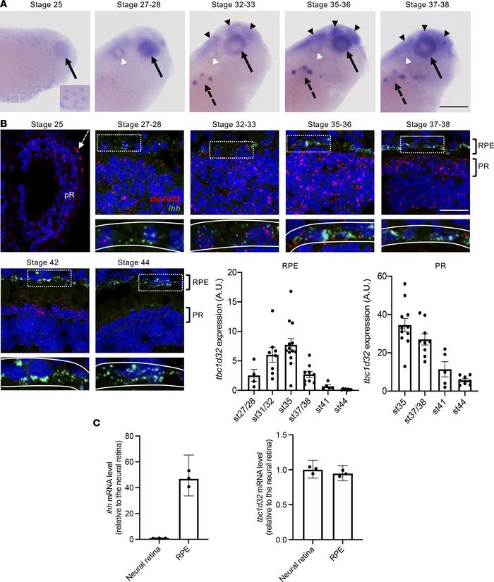 Figure 2. tbc1d32 expression during Xenopus development and retinogenesis. (A) Lateral views of Xenopus embryo heads (anterior to the right) following tbc1d32 whole-mount in situ hybridization. Enlargement: at stage 25, epidermal cells are stained. tbc1d32 expression is also detected in the eye (black arrows) and later in the pronephric nephrostomes (black dotted arrows), brain (black arrowheads), and otic vesicle (white arrowheads). (B) RNAscope in situ hybridizations for tbc1d32 and ihh on cryostat sections. A region of RPE cells, delineated by white dotted boxes in the upper panels, is enlarged in the lower panels, where the RPE layer is outlined (white lines). Scatterplots with bars represent the quantification of tbc1d32 expression in the RPE or photoreceptor layer at each stage (st). Data are represented as mean SEM. Each dot represents 1 retina. Scale bars = 400 m in A, 50 m in B. AU, arbitrary units; pR, presumptive retina; RPE, retinal pigment epithelium; PR, photoreceptors. (C) qPCR analysis of ihh and tbc1d32 expression in neural retina and RPE tissues, dissected at stage 3536. ihh serves as a specific RPE marker. Data are represented as geometric mean with 95% CI; n = 3 technical replicates. |