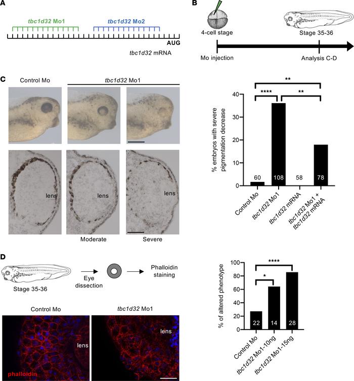 Figure 3. Xenopus RPE phenotype following tbc1d32 knockdown. (A) Mo1 and Mo2 target sequences located in the 5 untranslated region of tbc1d32 mRNA. (B) Diagram of the experimental design. (C) Upper panels, lateral views of 1 control and 2 morphant embryo heads with moderate and severe phenotypes (anterior to the right). Lower panels, transverse retinal sections of control and morphant embryos (dorsal side up). The bar plot represents the percentage of embryos with a severe decrease in pigmentation among control (control Mo), morphant (tbc1d32 Mo1), tbc1d32 mRNA-injected, and tbc1d32 Mo1/tbc1d32 mRNA coinjected groups. The total number of embryos analyzed per condition is indicated in each bar. **P < 0.01; ****P < 0.0001; Fishers exact test. (D) Phalloidin staining of filamentous actin on dissected eyes of control or morphant Xenopus embryos. The bar plot represents the proportion of eyes with an altered distribution of F-actin for each condition. The total number of eyes analyzed per condition is indicated in each bar. *P < 0.05; ****P < 0.0001; Fishers exact test. Scale bars = 400 m for whole mounts and 60 m for sections in C, 20 m in D. |