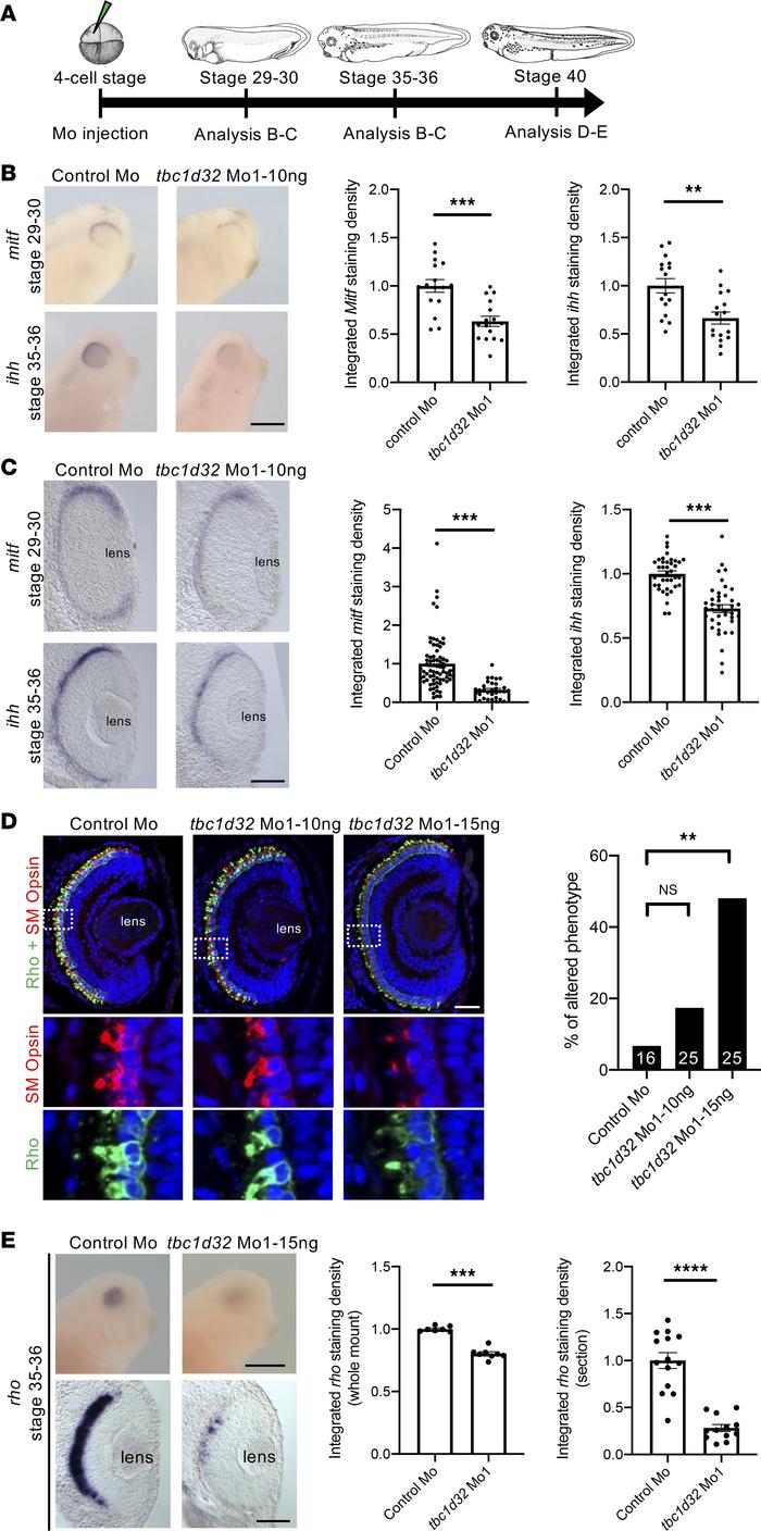 Figure 4. Xenopus RPE and photoreceptor marker expression following tbc1d32 knockdown. (A) Diagram of the experimental design. Whole mount (B) or retinal sections (C) following in situ hybridization against mitf or ihh, respectively, on embryos injected with control Mo or tbc1d32 Mo1. Scatterplots represent the quantification of the integrated density of the staining per eye relative to control Mo; each dot corresponds to 1 eye or 1 section, respectively. (D) Rho and SM opsin immunolabeling on retinal sections of embryos injected with control Mo or embryos injected with 2 doses of tbc1d32 Mo1 (10 or 15 ng). Lower panels, enlargement of the areas indicated by white dashed boxes in the upper panels. The bar plot represents the proportion of eyes with altered staining of Rho and SM opsin for each condition. The number of eyes analyzed per condition is indicated in each bar. Rho, rhodopsin; SM opsin, short and middle wavelength cone opsin. (E) Upper panels, whole-mount in situ hybridization against rhodopsin in embryos injected with control Mo or tbc1d32 Mo1. Lower panels, transverse retinal sections of control and morphant embryos. The scatterplots represent the quantification of the integrated density of rhodopsin staining relative to control Mo; each dot corresponds to 1 eye (left) or 1 section (right). For all scatterplots, data are represented as mean SEM. **P < 0.01; ***P < 0.001; ****P < 0.0001; Fishers exact test (D); 2-tailed Mann-Whitney test (B, C, and E). Scale bars = 400 m for whole-mount embryos and 40 m for sections. |