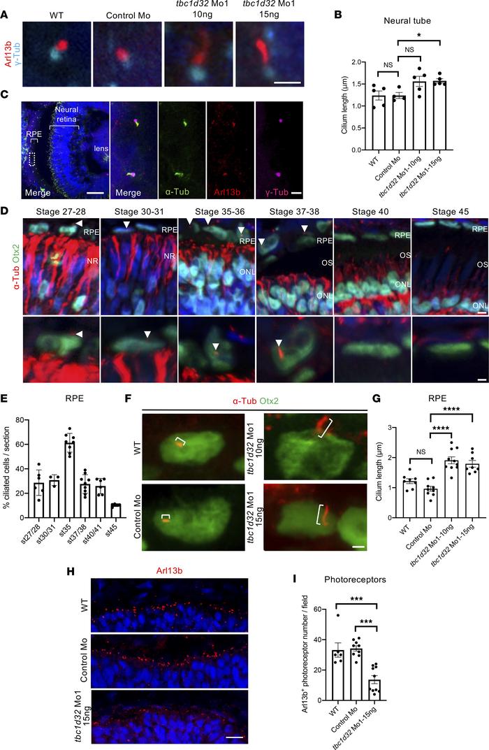 Figure 5. Xenopus ciliogenesis following tbc1d32 knockdown. (A) Arl13b and -Tubulin (-Tub) immunolabeling on neural tube sections of stage 3536 wild-type (WT), control Mo, or tbc1d32 Mo1 embryos. (B) Scatterplot shows the mean length of neural tube cilia. Each dot corresponds to the mean length for 1 embryo. (C) Immunolabeling of cilia markers, acetylated -Tubulin (-Tub), Arl13b, and -Tub, on retinal sections of stage 3536 WT embryo. The right panels show an enlargement of the area delineated by a white dotted box in the left panel. (D) -Tub immunolabeling of RPE cilia (arrowheads) at different stages. Sections are costained with Otx2 to identify RPE cells, which are enlarged in the lower panels. NR, neural retina; ONL, outer nuclear layer; OS, outer segment. (E) Proportion of ciliated cells among RPE cells at different stages (st). (F) -Tub and Otx2 immunolabeling showing primary RPE cilia (brackets) on retinal sections of stage 35 WT, control Mo, or tbc1d32 Mo1 embryos. (G) Scatterplot with bars showing the mean cilia length in RPE cells. Each dot corresponds to the mean length for 1 embryo. (H) Immunolabeling of Arl13b showing the photoreceptor connective cilium on retinal sections of stage 35 WT, control Mo, or tbc1d32 Mo1 embryos. (I) The scatterplot shows the mean number of Arl13+ ciliated photoreceptors in 1 field of the central retina. Each dot corresponds to 1 embryo. All data are represented as mean SEM. *P < 0.05, ***P < 0.001, ****P < 0.0001; 2-tailed Mann-Whitney test. Scale bars = 2 m in A and F, 50 m and 2 m for enlargements in C, 5 m and 2 m for enlargements in D, 25 m in H. |