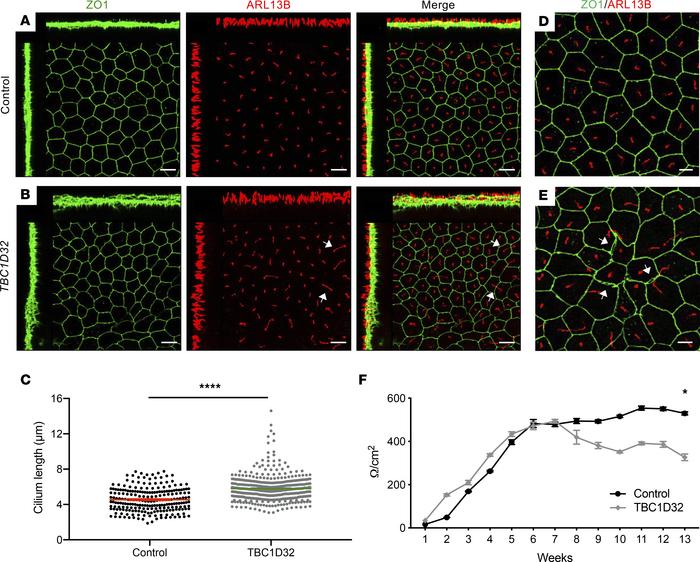 Figure 7. Morphology of the human iPSC-derived RPE. IF studies and maximum intensity projection (MIP) confocal imaging of control (A) and TBC1D32 (B) iPSC-derived RPE using antibodies directed against ZO1 and ARL13B. White arrows indicate elongated cilia. The disrupted TBC1D32 RPE monolayer can be seen on the orthogonal planes as compared with control. Scale bars = 10 μm. (C) Quantification of the cilium length in control (n = 229 cells) and TBC1D32 iPSC-derived RPE (n = 416 cells). Data are represented as mean ± SEM; ****P < 0.0001; Student’s 2-tailed t test. (D) Higher magnification of control iPSC-derived RPE showing the regular cobblestone morphology and cilia length. (E) Higher magnification of TBC1D32 RPE showing irregularly shaped cells, separated tight junctions (white arrows), and ZO1 aggregates. Scale bars = 5 μm. (F) Weekly TER measurements expressed in Ω/cm2 in control (black line) and TBC1D32 (gray line) iPSC-derived RPE. Data are represented as mean ± SEM; *P < 0.05; n = 4 inserts; 2-tailed Mann-Whitney test. |
