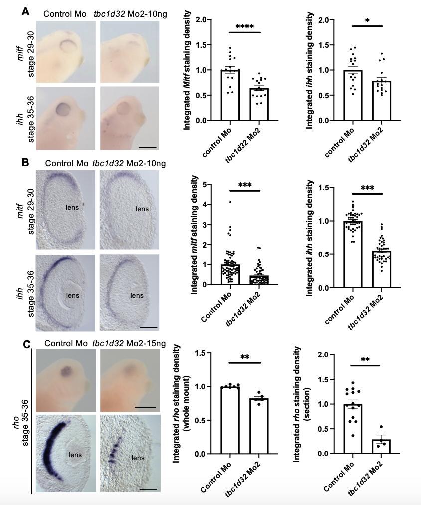 Supplemental Figure 7. Xenopus RPE marker expression following tbc1d32 knockdown. A) Whole mount in situ hybridization against mitf or ihh on embryos injected with control Mo or tbc1d32 Mo2 (lateral views of the head, anterior to the right). Scatter plots with bars represent quantification of the integrated density of mitf or ihh staining per eye relative to control Mo; each dot corresponds to one eye. B) Representative images of mitf or ihh staining on retinal sections of control or morphant embryos (dorsal side up). Scatter plots with bars represent quantification of integrated density of mitf or ihh staining relative to control Mo on retinal sections; each dot corresponds to one section. C) Upper panels, whole mount in situ hybridization against rhodopsin (rho) in embryos injected with control Mo or tbc1d32 Mo2. Lower panels, transverse retinal sections of control and morphant embryos (dorsal side up). The scatter plots represent the quantification of the integrated density of rho staining relative to control Mo; each dot corresponds to one eye or one section. For all scatter plots, data are represented as mean SEM. *p<0.05; **p<0.01; ***p<0.001; ****p<0.0001; Mann and Whitney test. Scale bars = 400 m for whole mounts and 40 m for sections. |