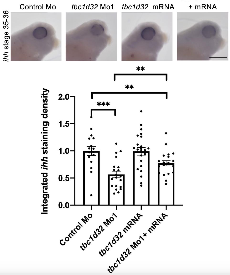 Supplemental Figure 9. ihh expression following tbc1d32 Mo and mRNA co-injection. Whole mount in situ hybridization against ihh on stage 35-36 embryos injected with standard Mo, tbc1d32 Mo1, tbc1d32 mRNA, and tbc1d32 Mo + tbc1d32 mRNA (lateral view of the head, anterior to the right). Scatter plot with bars represents the quantification of ihh staining integrated intensity per eye relative to control Mo, each dot corresponding to one eye. Data are represented as mean SEM. **p<0.01; ***p<0.001; Mann and Whitney test. Scale bar = 400 m. |